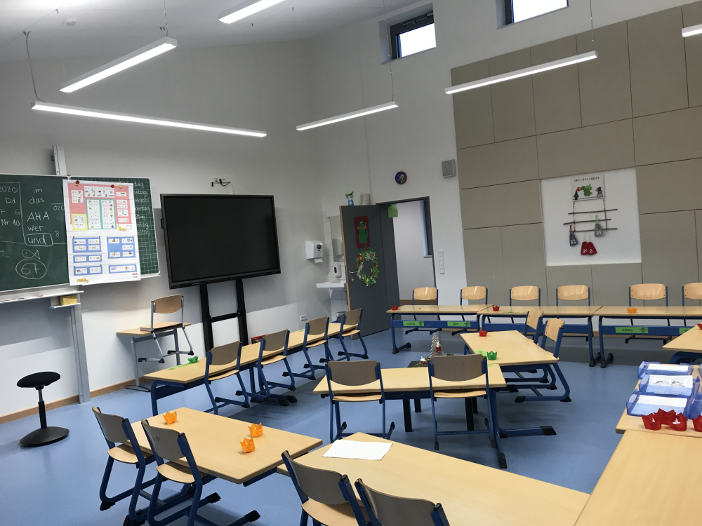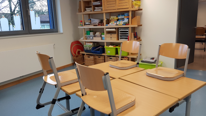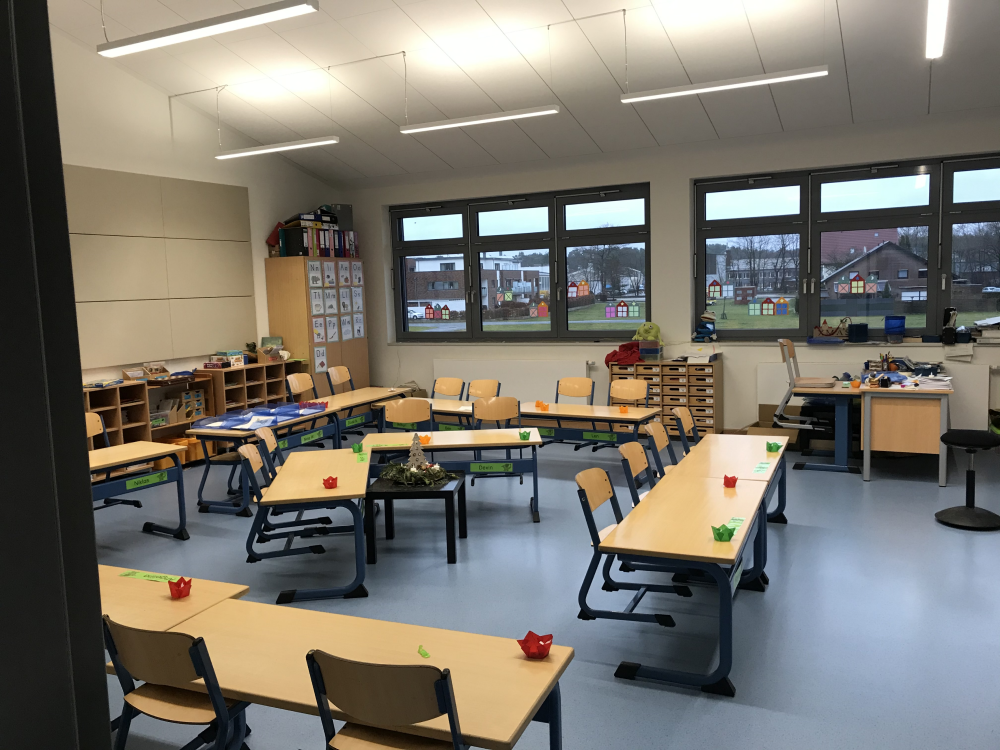 Die größten Klassenräume, an die sich jeweils ein Gruppenraum anschließt, werden von den Klassen im Gemeinsamen Lernen sowie den Ganztagsklassen genutzt. In diesen Klassen besteht ausreichend Raum, um Funktionsecken und Förderbereiche für differenziertes Arbeiten einzurichten.