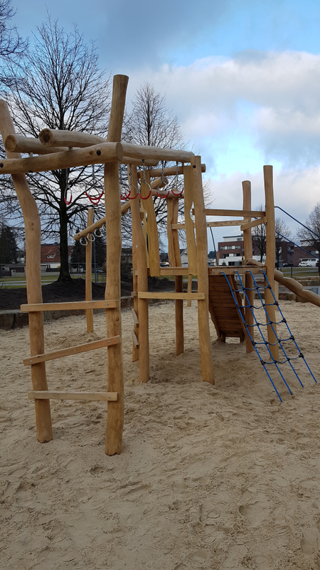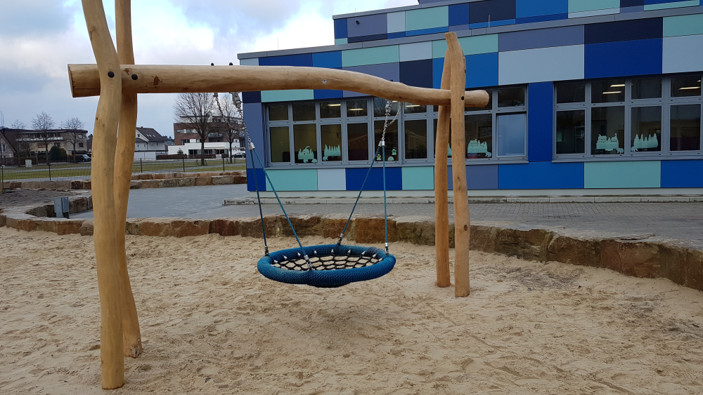 Auf dem neu gestalteten Schulhof gibt es neben dem Sandspielbereich Spielgeräte, Ruhe- und Bewegungsbereiche und ein Ballspielfeld.